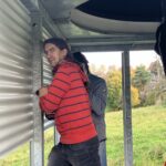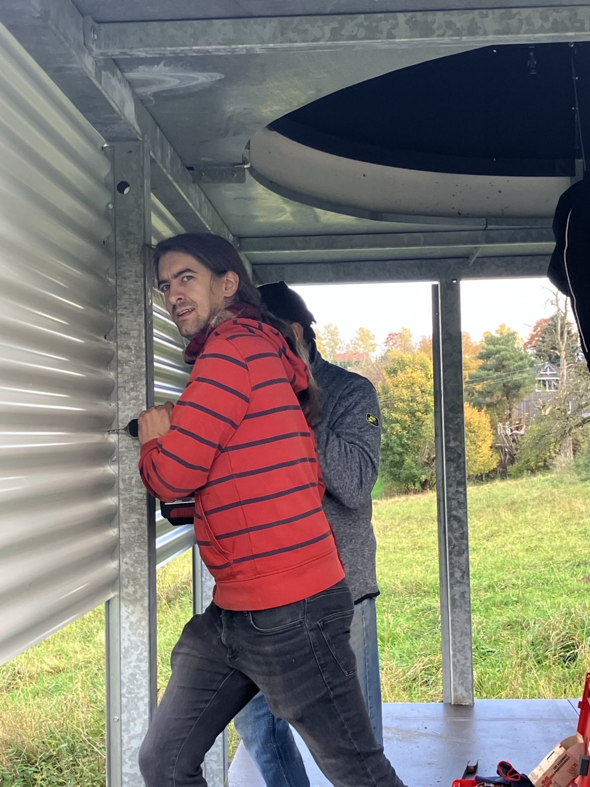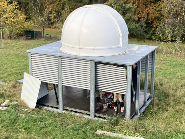We have now begun installing corrugated sheet metal walls in the building of our lower auxiliary station below the service building. In doing so, we are following a construction philosophy that we have already implemented at the upper auxiliary station next to the service building and at the student laboratory. The main advantages are extremely fast temperature regulation for low air turbulence and unlimited durability. The building will protect a larger telescope with a high-resolution slit spectrograph under its fiberglass dome. This system will also be controlled from the control room in the service building. The station thus forms an educational bridge between the school lab and the large telescope.